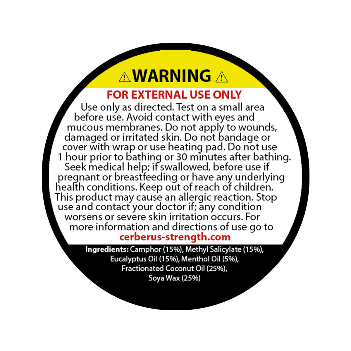 CERBERUS SubZero Muscle Rub contains a massive 15% of Camphor, 15% of Methyl Salicylate, 15% Eucalyptus Oil and 5% Menthol. Camphor has been shown to increase blood circulation and has anti-inflammatory properties. Methyl Salicylate is closely related to aspirin and has analgesic and anti-inflammatory properties, while menthol works by creating a topical cooling action that desensitizes local nociceptors to offer an analgesic effect. Eucalyptus oil also has a cooling effect similar to menthol’s anti-inflammatory and antibacterial properties, and can have analgesic effects in muscles and joints. A 2015 clinical review found that eucalyptus oil has promise in treating ailments like arthritis and wounds as well as the flu.